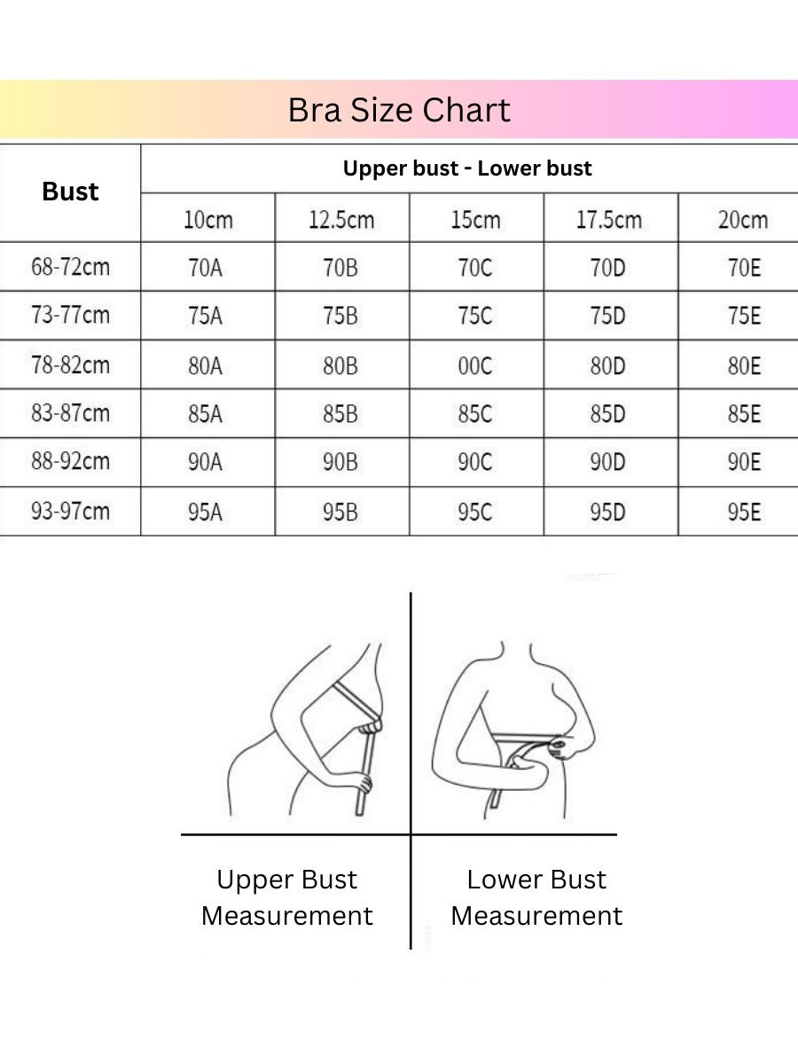 Bra size | 32/70A | 32/70B | 32/70C | 34/75A |34/75B | 34/75C | 36/80A |36/80B | 36/80C | 38/85B | 38/85C |